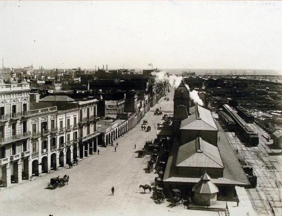 Vista de El Bajo, un área de cruising (conocida localmente como yire) para hombres homosexuales en Buenos Aires, c. 1895, con la calle Paseo de Julio (hoy avenida Alem) y la Estación Central (derecha), que fue completamente destruida por un incendio en 1897.